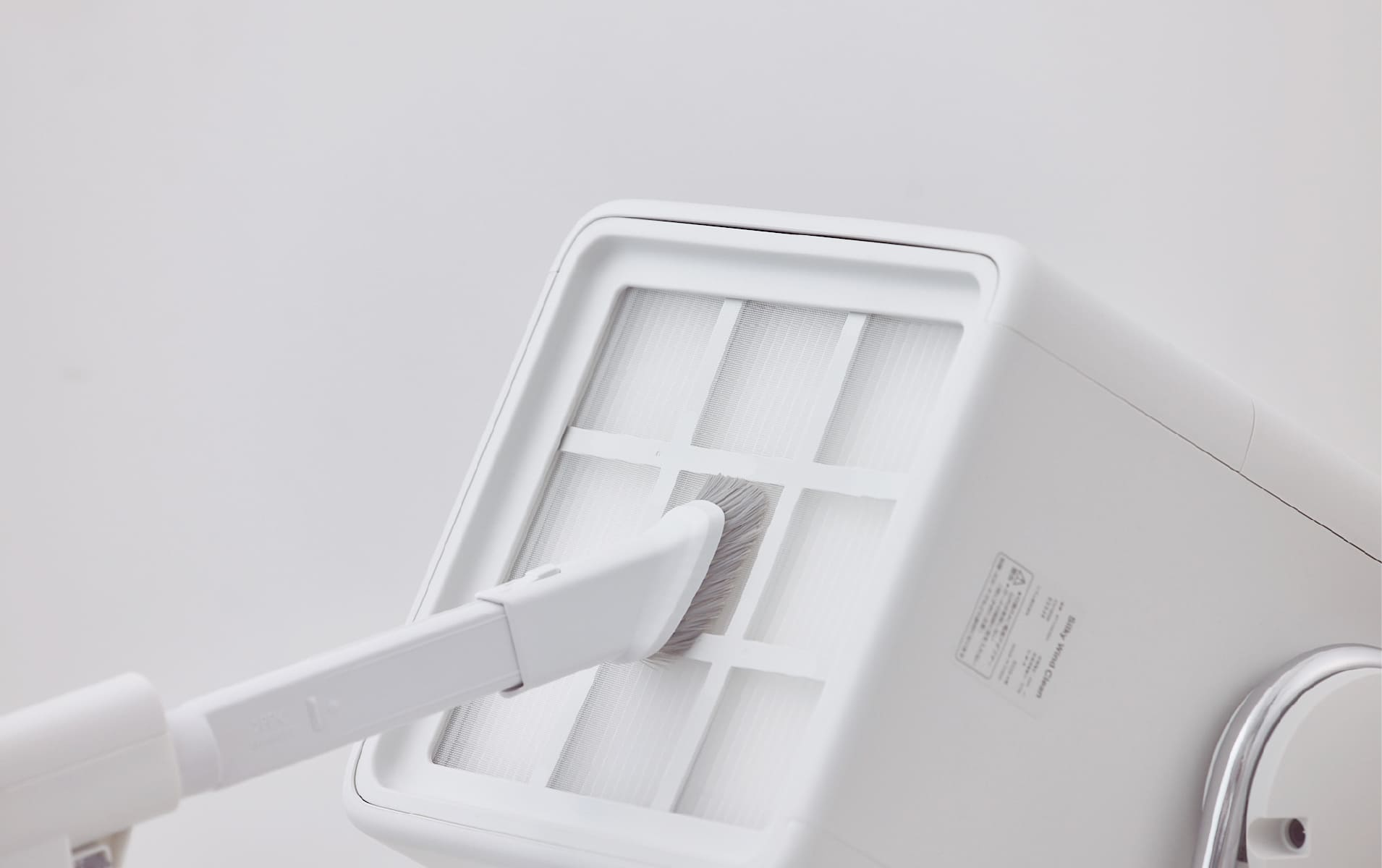 プレフィルターは汚れ具合が把握でき、すぐに掃除機などでお手入れがしやすいよう外側からアクセスできるようにしています。