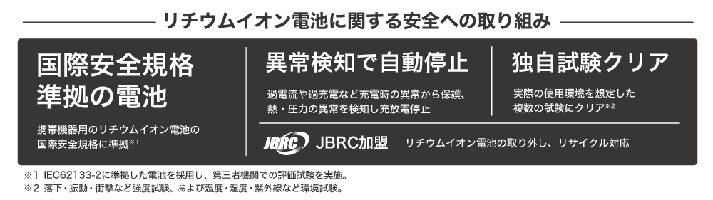 ※1 IEC62133-2に準拠した電池を採用し、第三者機関での評価試験を実施。