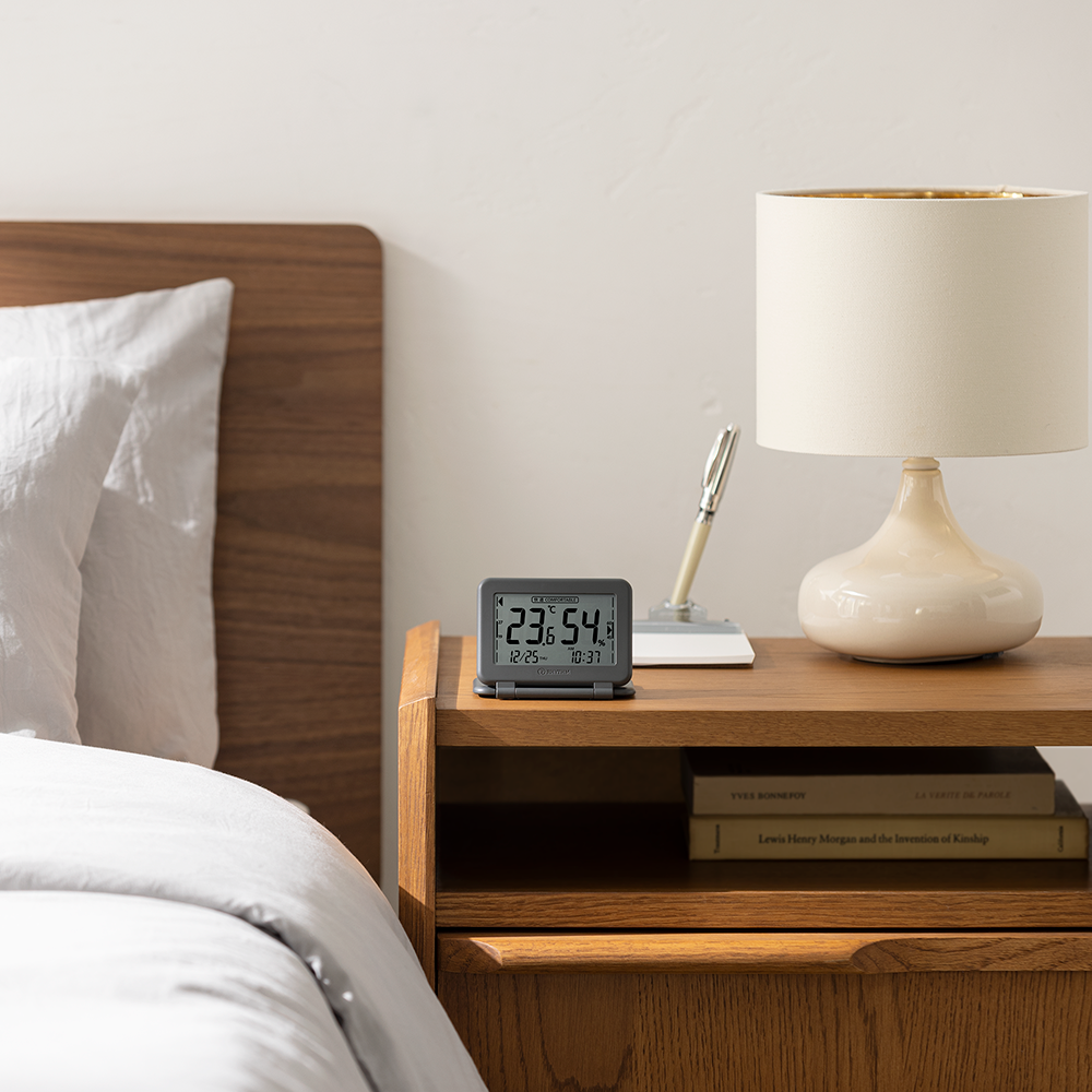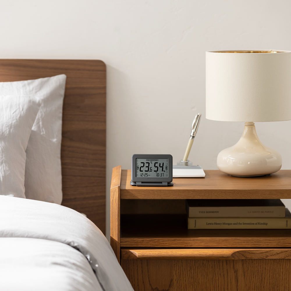 持ち運びやすいコンパクトサイズの高精度温湿度計です。 温度、湿度ごとの現在の状態をカーソルで表示し、快適な環境に近づけるため取るべき行動が直感的にわかります。 ライトボタンで液晶部のライトが点灯。ボタンを押している間と離してから5秒間、液晶部を照らします。スヌーズ機能付きのめざましアラームを搭載しており、 トラベルクロックとしても便利に使用いただけます。