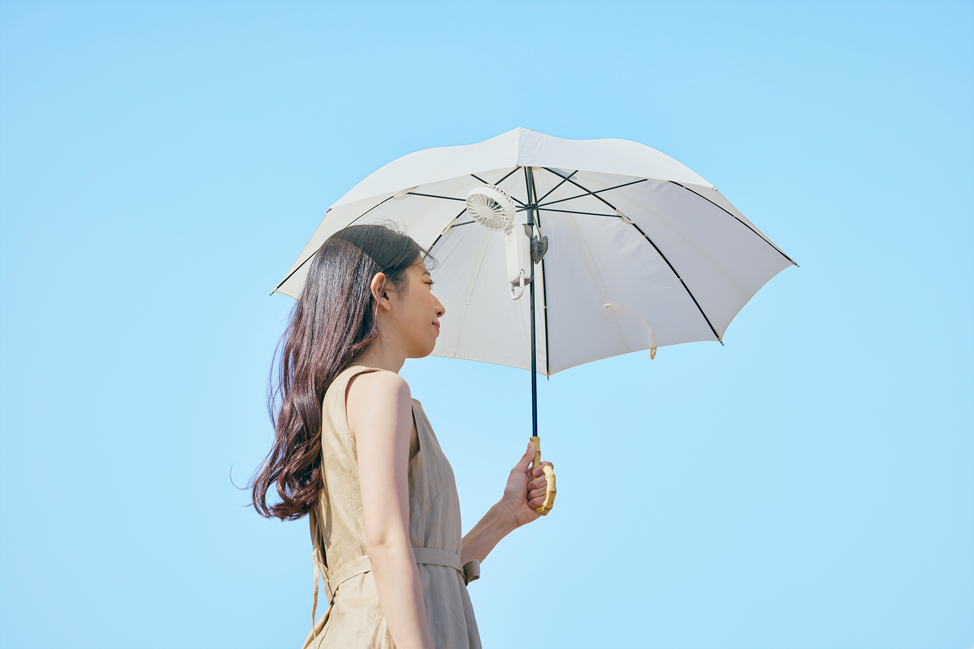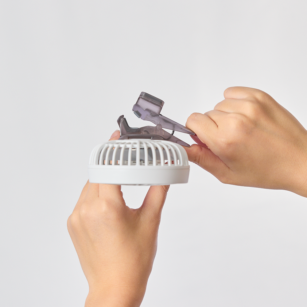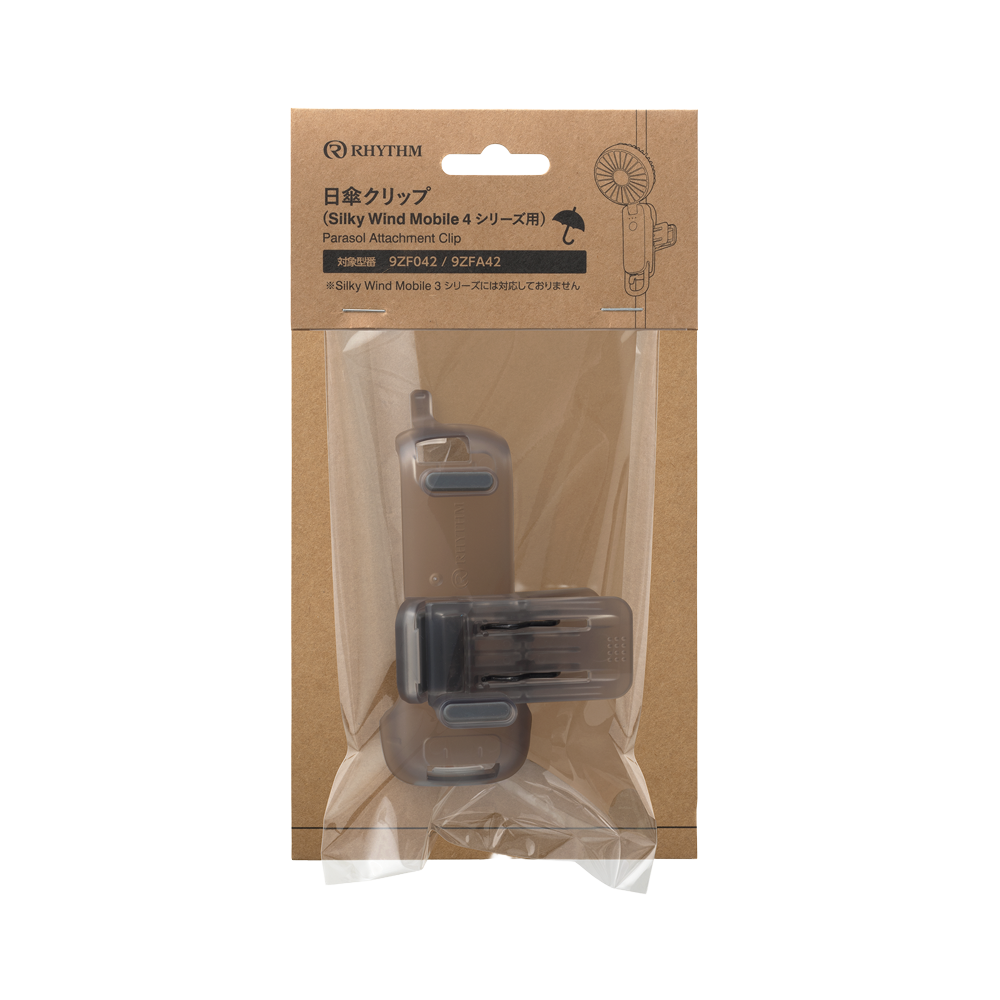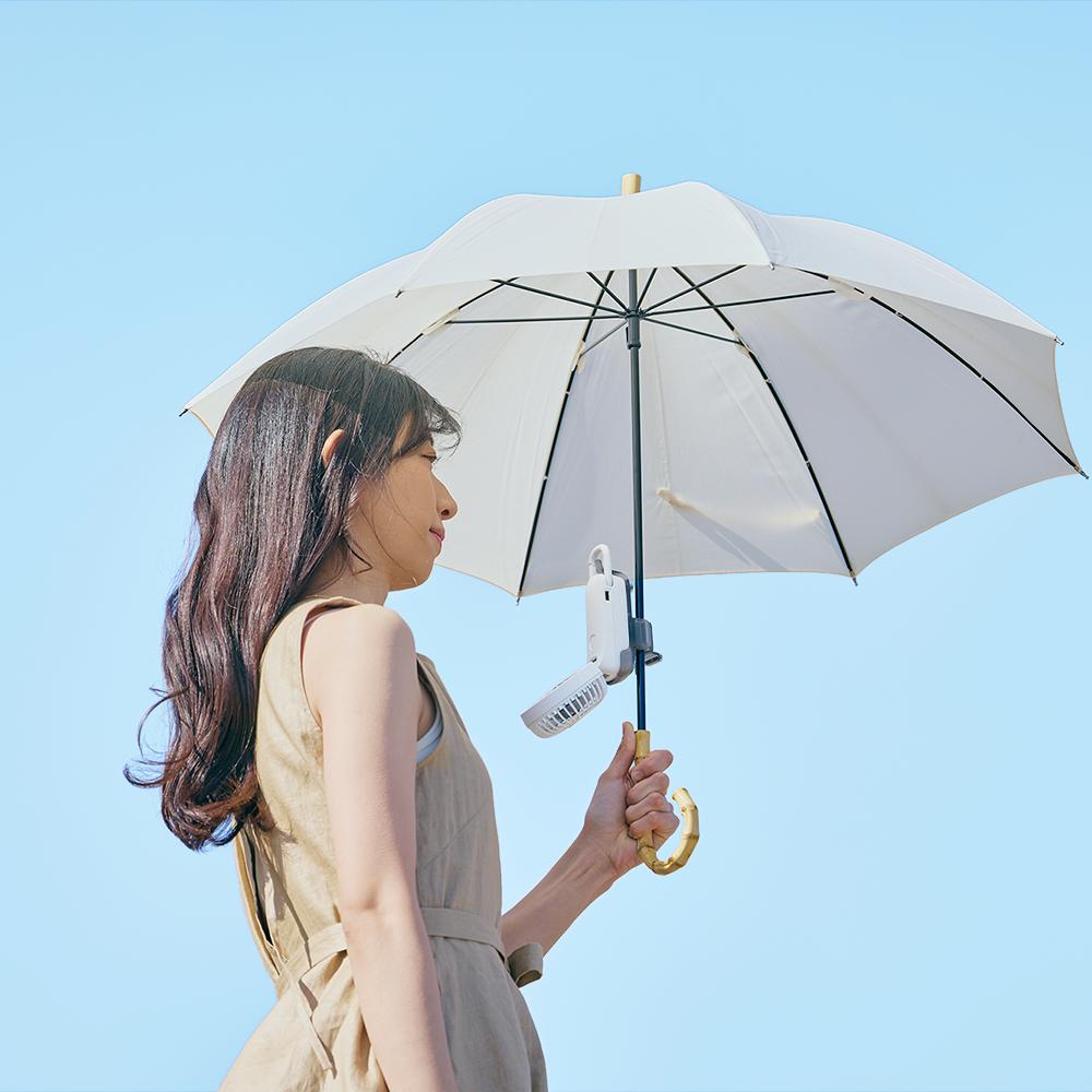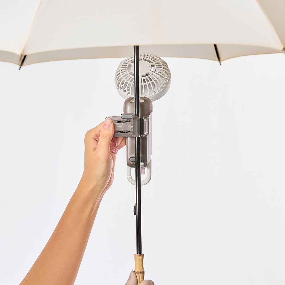 大風量の2重反転ハンディファン Silky Wind Mobile 4シリーズ を日傘に取り付けられるクリップです。歩いている時に心地よい涼しさを感じられるベストな風を考えました。