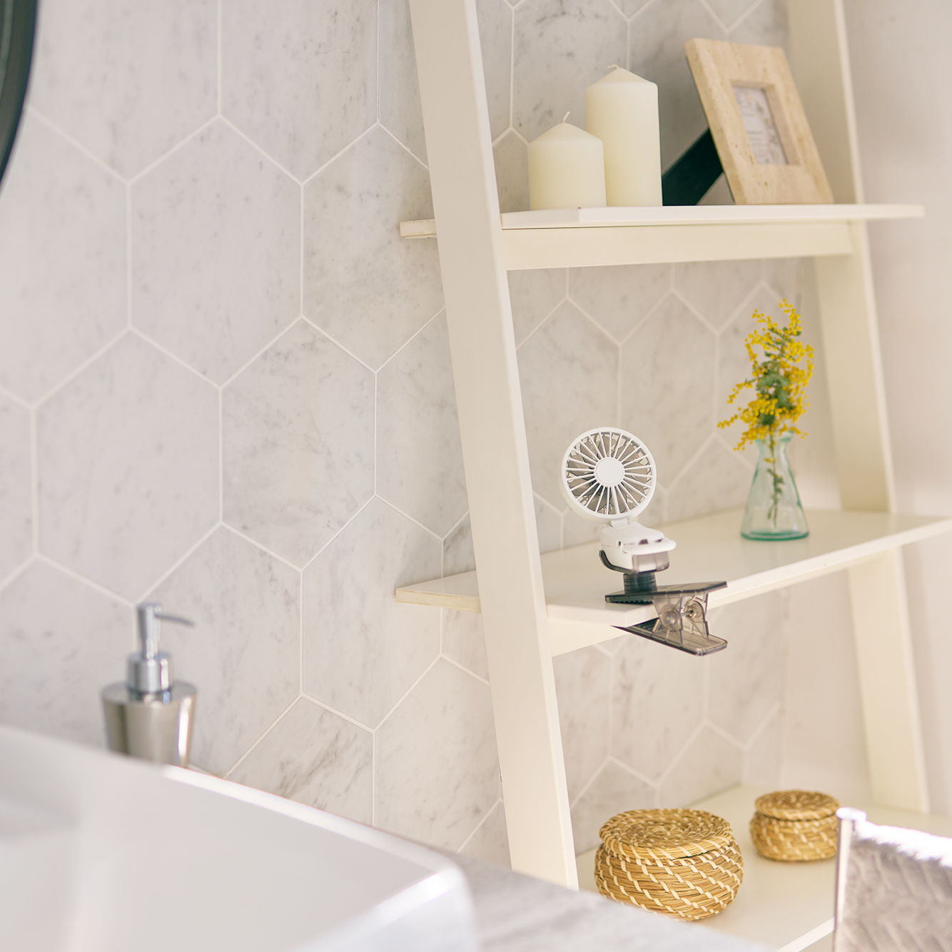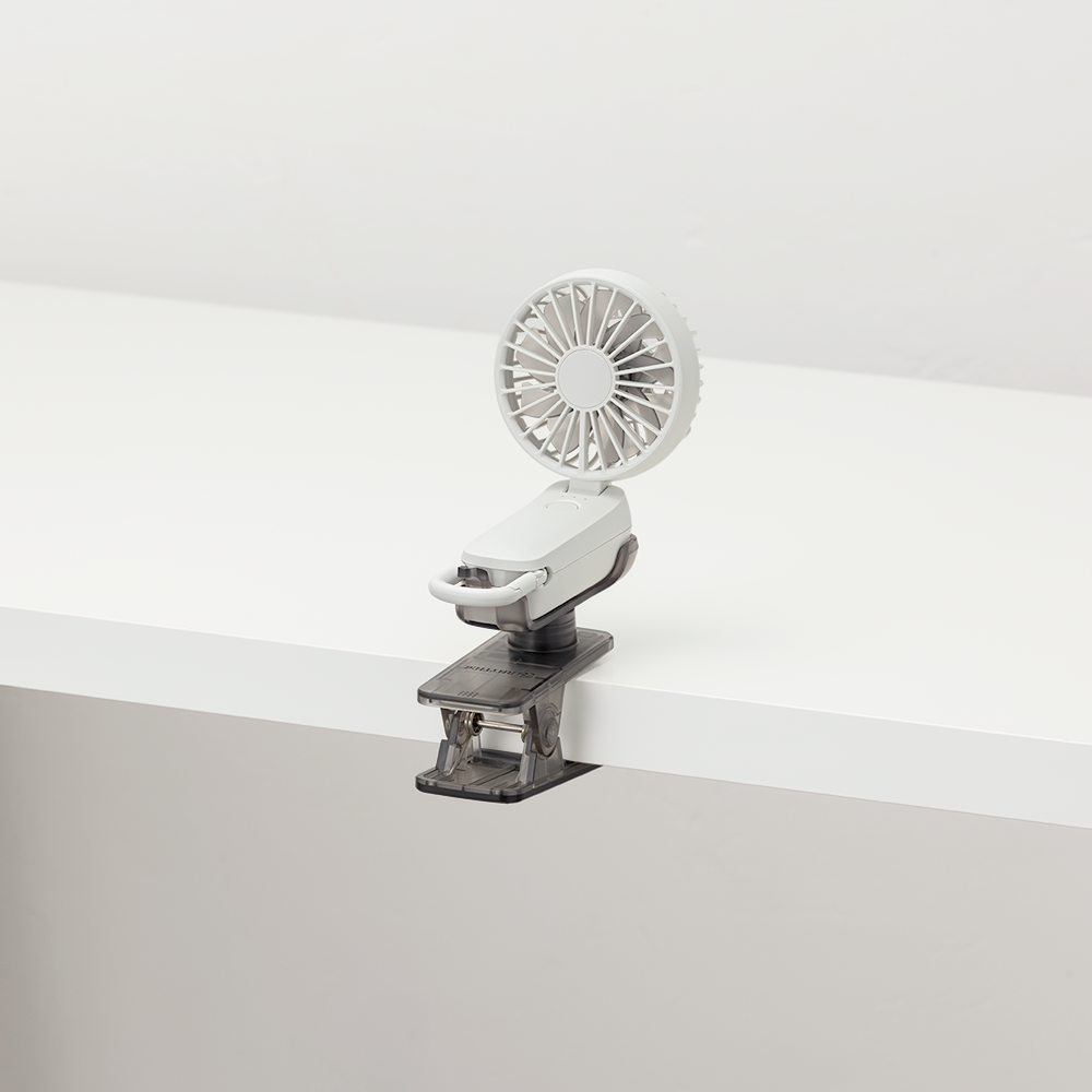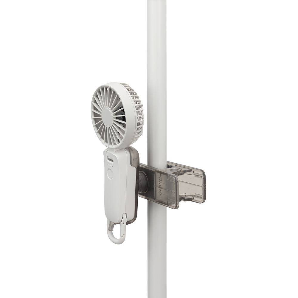 クリップ部が360度回転し、さまざまな方向にハンディファンを固定する事が可能なため、ファンの向きを狙った所に合わせる事ができます。ずれにくい構造で、ベビーカーやペットカート、テーブル、家具の縁など、さまざまな場所に取り付けて使用できます。ベビーカーやペットカート使用時に両手がふさがってしまう場面や、置き場に困る場面でも、位置を固定してハンズフリーで風に当たることができます。テーブル縁に取り付けて、入浴後やメイク中に洗面所の棚やポールに取り付けて。屋内外を問わず、使用シーンは無限大です。